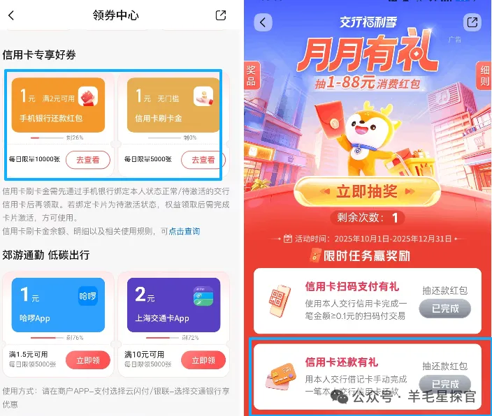 四、交通银行:8.8元云网券 + 每周抽3次+周周领 + 月月领(长期可蹲)1. 每周 “消费抽抽抽”每周