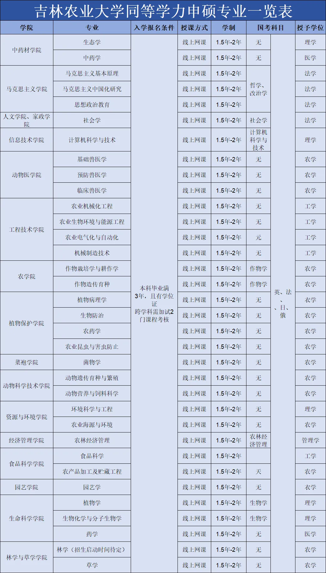 吉林农业大学同等学力申硕招生专业丰富,药学,中药学,兽医学,畜牧学,生物学,园艺学,社会学,林学,农学,草学,食品科学与工程,农业经济管理,农业工程,计算机科学与技术,马克思主义理论等,🉑跨专业申请