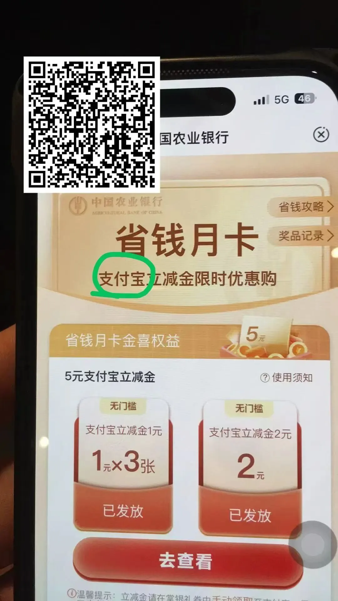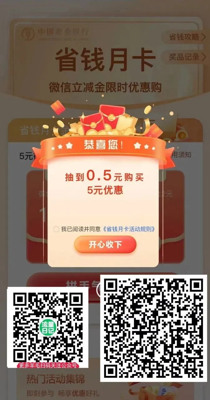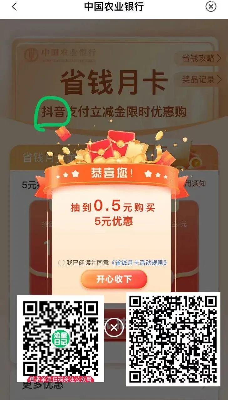 农行省钱月卡活动来了!这次分为微信、抖音、支付宝各领5立减金,支付宝立减金目前显示入口升级,大家自己去试哈!