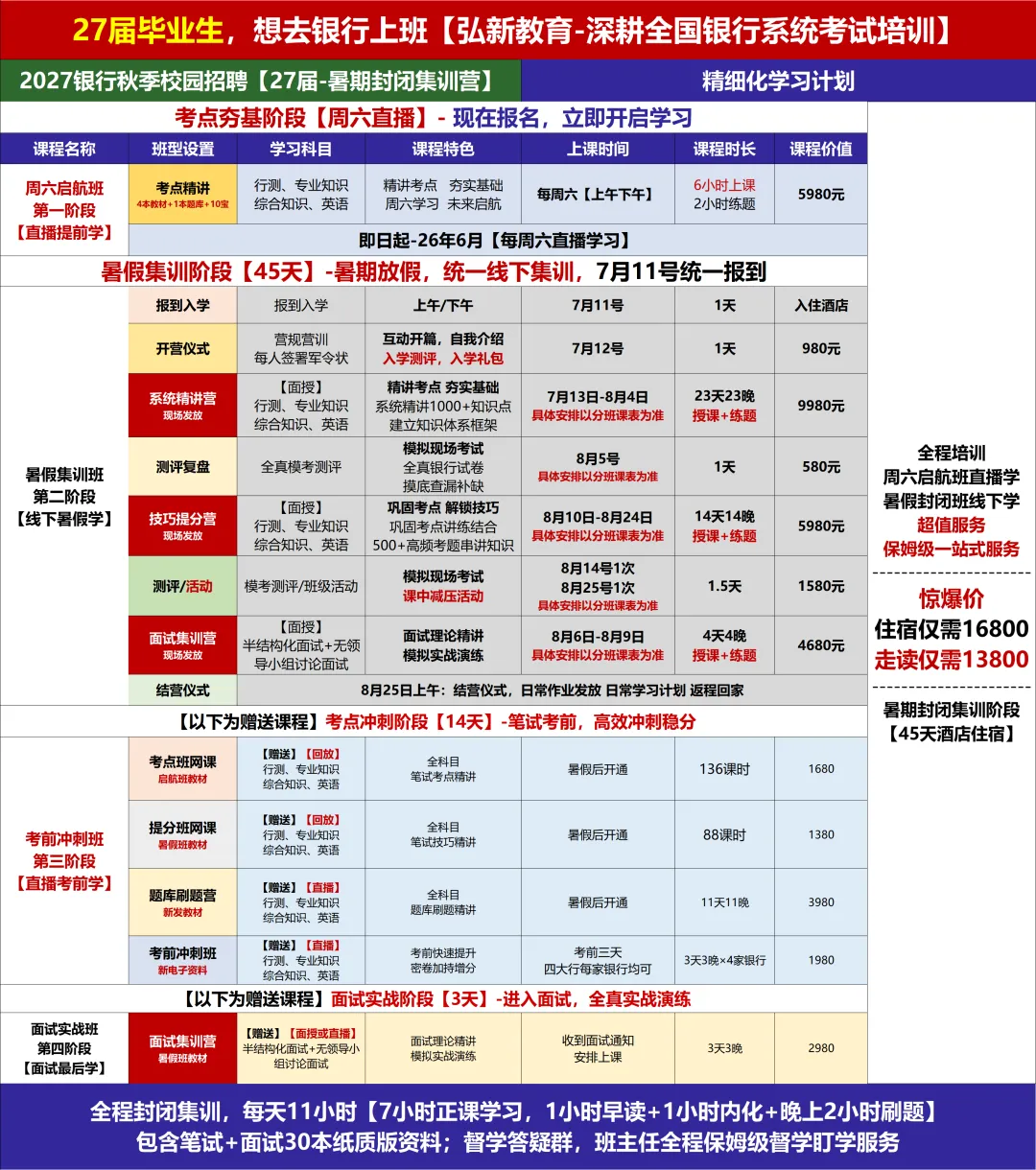 【笔试培训】入学测评+系统精讲23天23晚+阶段测评+技巧提分14天14晚+阶段测评+面试集训4天4晚+结营仪式【赠送笔试】考点班网课+技巧提分班网课+题库刷题营直播11天11晚+考前冲刺(中农工建)直播【赠送面试】集训3天3晚(线上或者线下)