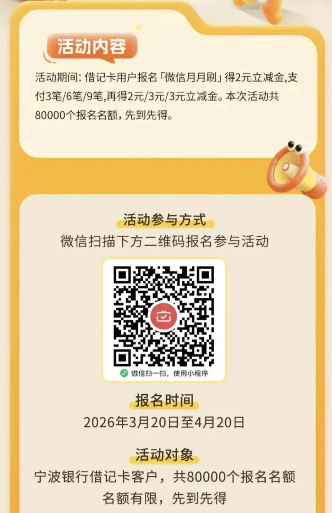 长时间按住上方图片中的二维码即可报名宁波银行微信支付月月刷。