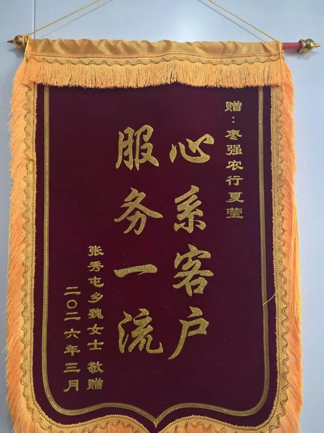 据魏女士介绍,此次被烧毁的钱款为家中老人积蓄,意外失火后老人心疼不已、彻夜难眠。难题得以顺利解决,魏女士及家人深受感动,多次向工作人员表达谢意。为感谢枣强农行营业室急客户之所急、解客户之所忧的贴心服务,魏女士专程送来印有“服务一流 心系客户”的锦旗,对农行员工专业、高效、暖心的金融服务给予高度认可与赞扬。