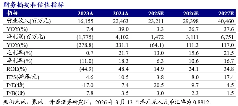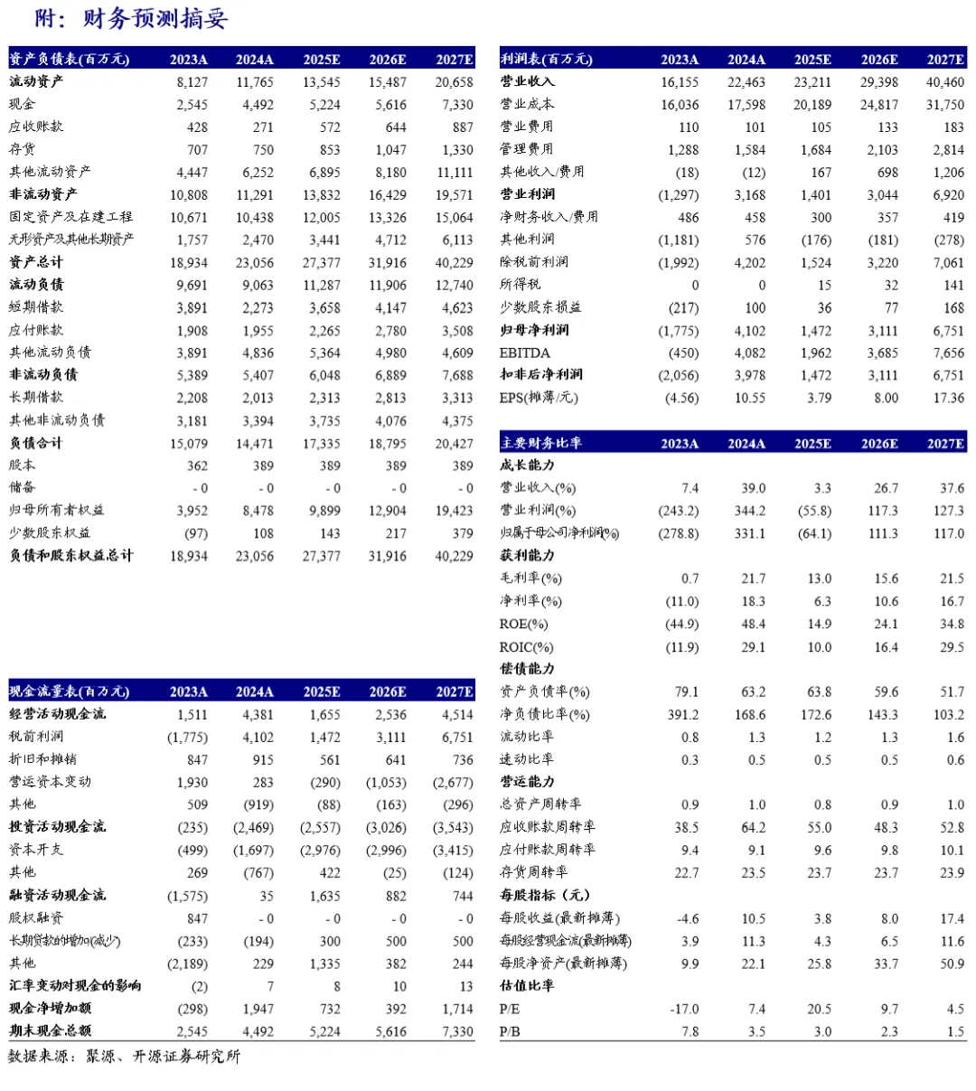 综上,我们预计2025-2027年公司总营业收入分别为232.11、293.98、404.60亿元,同比+3.33%、+26.66%、+37.63%;归母净利润分别为14.72、31.11、67.51亿元,同比-64.10%、+111.29%、+117.00%。