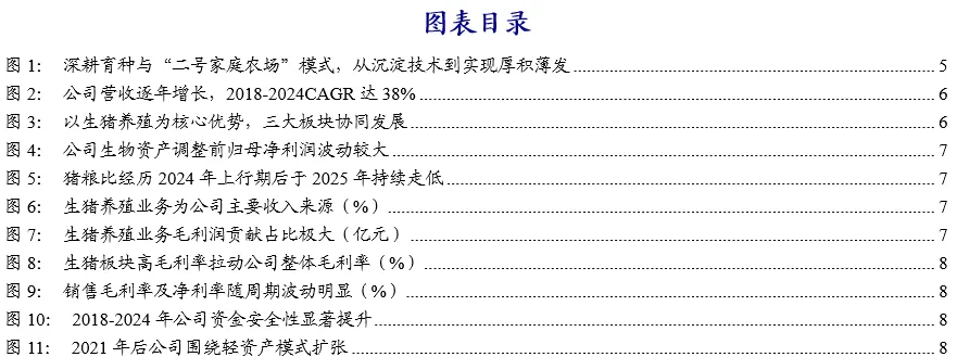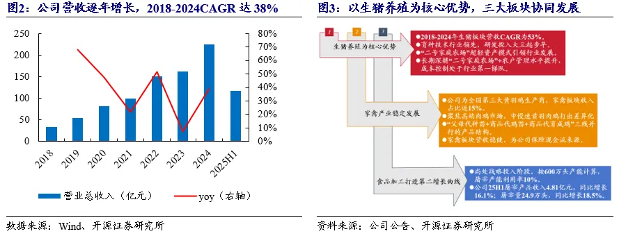 公司已构建起“生猪养殖+食品加工+家禽产业”三大板块协同发展的格局。营收方面,2024年公司实现营业收入224.6亿元,2018至2024年复合增长率达38%。前期模式+技术铺垫进入兑现期,2024年公司出栏大增带动营收高增。(1)生猪养殖板块,公司依托自主搭建的双国家级核心育种场,实现从基因选育到商品猪出栏的全产业链闭环,2018-2024年生猪板块营收CAGR为53%,保持行业领先增速的同时养殖成本控制水平稳居行业前列。(2)食品加工板块,公司拥有年屠宰600万头的食品加工矩阵,预计产能将在未来逐步释放。(3)家禽板块,凭借西南最大黄羽鸡种源优势,以高端慢速鸡为核心产品,公司2018年-2024年黄羽鸡出栏量CAGR为10%,2025年黄羽鸡市占率提升至2.1%。