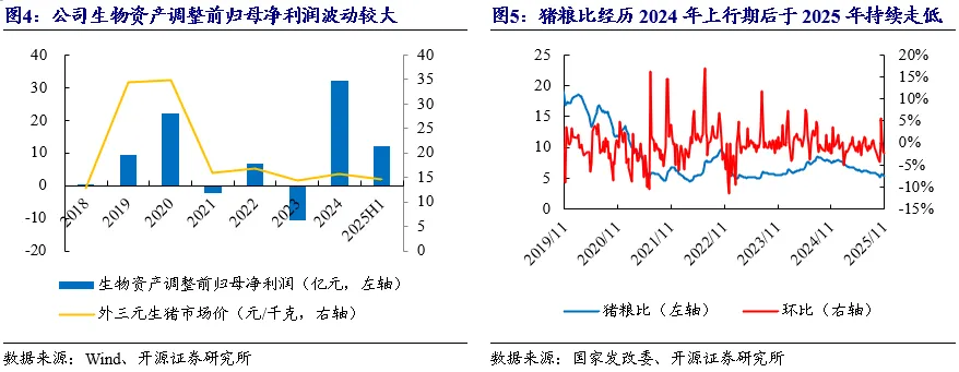 公司以生猪养殖为核心业务,利润端深度映射生猪行业强周期属性。2019-2020年受益于非瘟导致的供给缺口,猪价高位运行,2019年和2020年公司公允价值调整前归母净利润分别为9.25和21.92亿元;2021年行业产能释放引发价格下行,叠加公司规模扩张拖累,当年利润出现自2018年以来的首次亏损。至2024年,公司通过生产效率优化、饲料成本下行(2024年生猪养殖饲料原料价格降幅达14 %)及行业猪价回暖(2024年12月全国生猪出场价格同比上涨12%)三重因子共振,实现利润水平突破历史峰值,公允价值调整前归母净利润达到31.98亿元。2025H1猪价长期在成本线以上运行,产业整体保持较好盈利,公司公允价值调整前归母净利润为12.05亿元。