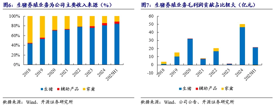 生猪养殖业务为公司收入、毛利润的主要来源。2018年至2024年公司生猪出栏量CAGR达44%,远超同期全国生猪出栏量总量CAGR的0.2%。2018年至2024年公司黄羽肉鸡出栏量CAGR为10%,且出栏增速逐渐放缓。战略重心向生猪养殖倾斜,生猪板块营收占总营收比例由2018年的43.6%提升至2024年的81.3%。2025H1公司生猪养殖业务贡献公司84.5%的收入和101.8%的毛利润。毛利率角度看,生猪养殖板块拉高公司整体毛利率,同时使得公司销售毛利率及销售净利率随周期波动明显。