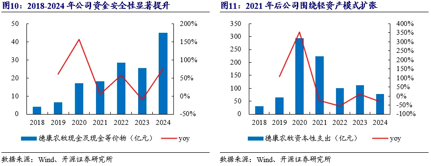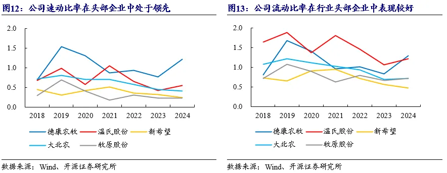 公司整体财务结构保持稳健,经营杠杆持续改善,资金安全性显著提升。资产负债率方面,2024年末公司资产负债率降至62.76%,较2023年末高位下降16.88pcts。行业横向比较看,公司资产负债率处于同期生猪养殖上市公司中游水平,财务结构稳健。货币资金储备亦呈现持续增强态势,公司账面货币资金自2018年起稳步提升,2024年末达44.92亿元,较2023年同比增长76.5%,体现出经营现金回流能力与融资能力。同时,公司资本性支出于2021年后明显下降,体现公司坚定轻资产模式运营。偿债能力方面,公司速动比率与流动比率均在行业中保持领先,2024年末公司速动比率为1.2,流动比率为1.3,体现公司强大财务根基和高效运营体系。