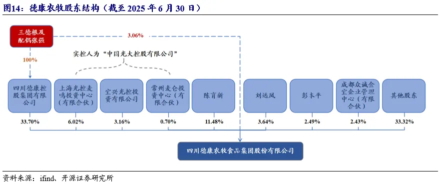 公司股权结构稳定且集中,创始人王德根为公司实际控制人。自2011年个人收购公司前身股权并专注于养殖业务以来,王德根始终为最大股东。截至2025年6月30日,他通过直接持股公司3.06%股份及通过控股四川德康间接持股33.7%,合计控制公司36.76%的表决权,实现了对上市主体的实质性控制,保障了经营决策的连贯与稳定。公司第二大股东中国光大控股有限公司相关实体合计持股约9.87%,2个员工持股平台众诚金宜、同创德恒合计持有2.87%股权。集中、稳定的股权架构符合农牧行业长周期发展的特征。
