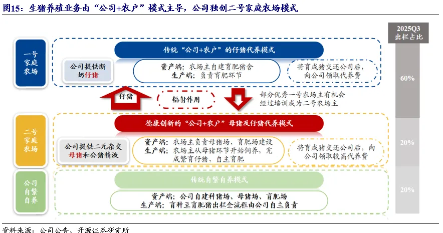 德康采用“公司+农户”与自繁自养并行的发展模式,其中“公司+农户”代养模式为主导。2025Q3,公司代养模式出栏占比约80%。作为行业后起追赶者,公司在生猪养殖模式布局上走出特色道路,实现弯道超车。在传统“公司+农户”代养仔猪的模式上,结合自身种猪优势,公司于2015年提出行业创新的养殖模式——“二号家庭农场”模式。自此,生猪养殖板块形成三驾马车并行的业务模式:公司的自营农场、“一号家庭农场”、“二号家庭农场”,可分别理解为传统自繁自养模式、传统“公司+农户”的仔猪代养模式、德康创新的“公司+农户”母猪及仔猪代养模式。