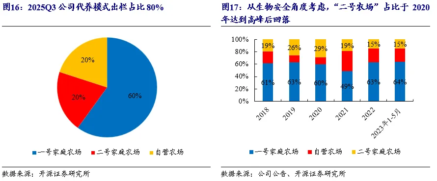 “二号农场”模式与“一号农场”模式设计存在根本性差异。“一号家庭农场”:沿用传统生猪代养模式,农场主自建育肥猪舍,向公司领取断奶仔猪并育肥,按约定标准交付成品猪后领取代养费。“二号家庭农场”:核心特征在于农场主持有能繁母猪等核心生产资料,并同时负责母猪场、育肥场建设,公司提供二元杂交母猪和公猪精液,农场主从能繁母猪环节开始饲养。2025Q3,公司“二号家庭农场”、“一号家庭农场”、自繁自养模式出栏占比分别约为20%、60%、20%。
