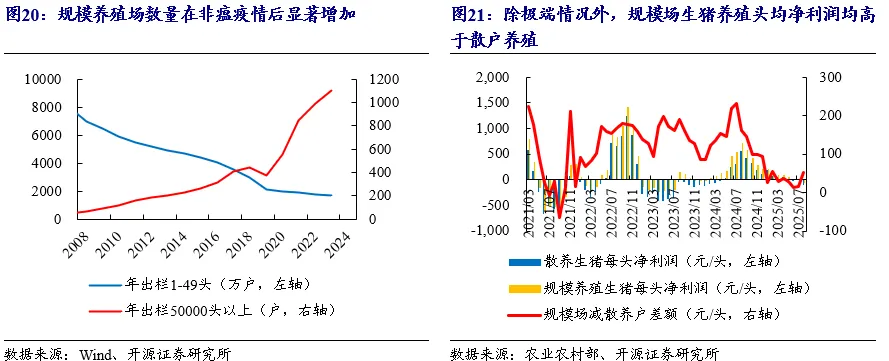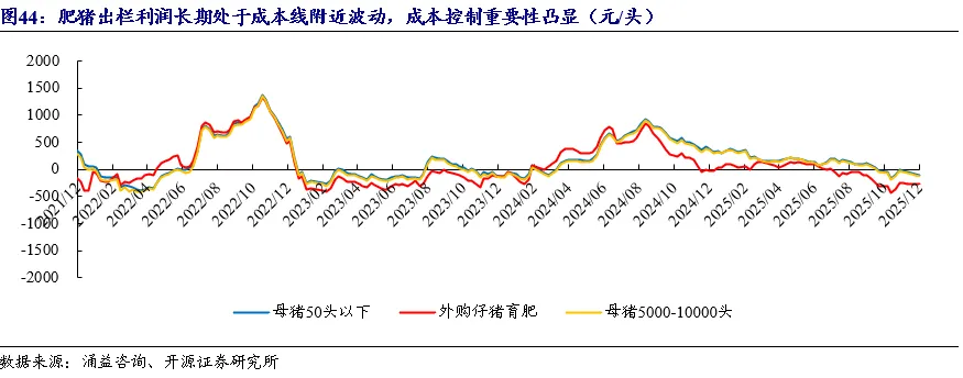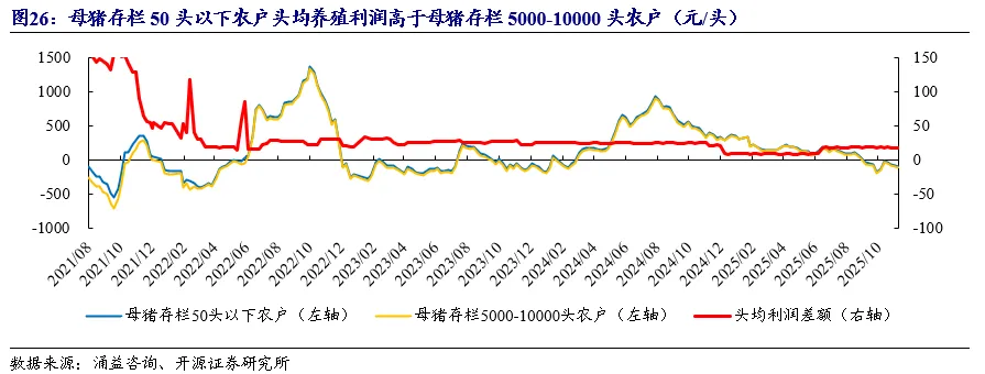 养殖效率角度看,适度规模化的生猪养殖单元效率更高,“二号农场”相较大型规模场更注重养殖细节与品质。生猪养殖在到达一定规模程度后会出现规模不经济效应,规模过大带来动物疫病风险和防治支出增加,养殖密度过大则使肉质降低。“二号农场”对应的适度规模的生猪养殖单元更适应当前中国生猪养殖国情,个体农户小规模养殖更注重养殖细节,叠加二号农场主的选拔标准更高、素质更强,得以更有效控制成本并确保养殖品质,最终生产成绩往往高于大规模集团养殖。据涌益咨询,2021年8月至2025年11月期间,母猪存栏50头以下农户头均养殖利润始终高于母猪存栏5000-10000头农户的头均养殖利润。