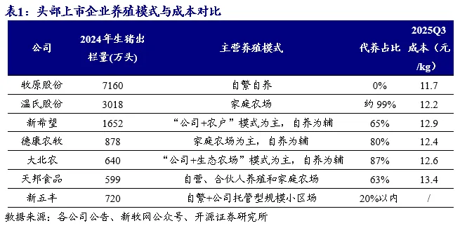 “反内卷”等产能调控政策指引下,头部猪企期待通过轻资产模式转型实现高质量发展。2025年6月以来发改委、农业农村部多次召开生猪产能调控会议,围绕"控产能(能繁母猪)、降体重(出栏均重)、限二育(二次育肥)"三个方面进行调控,压缩供给弹性,稳定猪价中枢,并推动头部猪企100万头能繁调减目标落地执行。截至2025Q3,据对12家上市猪企的统计,已有9家上市猪企代养出栏比例超过20%,其中成本处于第一梯队的企业中,温氏、德康、神农都以代养模式为主导,华统、东瑞股份、金新农等自繁自养为主的猪企于2024–2025年开启代养合作模式。