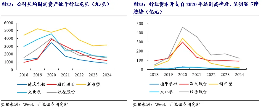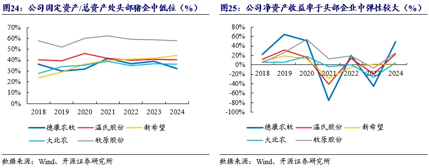 轻资产推动行业头均成本下降,代养模式助力企业实现高盈利质量与高周转,强化规模优势。头均固定资产正处于快速下降阶段,背后原因包括两方面:(1)前期“超前建场”产生的固定资产正在通过出栏量增长被摊薄;(2)头部企业正通过增加与农场合作的方式进行规模扩张,以降低资本投入,使边际资产更轻、周转更快。德康农牧2024年实现头均盈利409.86元,为头部上市猪企中最高,头均固定资产仅850元/头,明显低于头部上市猪企。从ROE、现金流结构到盈利质量均具备强竞争力。轻资产扩张路径不但降低了行业经营风险,更强化了成本领先企业的规模优势。