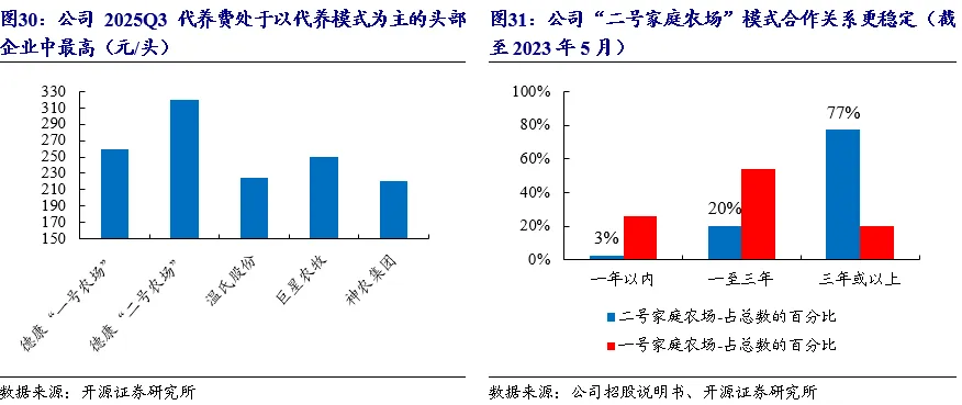 “二号农场”农户绑定更深合作更稳定,德康仔猪质量好+风险共担机制+更优利润反馈为核心因素。“二号家庭农场”的农场主需要掌握母猪和育肥猪的养殖技术以及育种技术,因此公司会对农场主进行严格选拔与长期培训,并依靠合同达成长期稳定的合作关系。二号家庭农场模式下,农场主的回报直接反映在仔猪存活率等关键绩效指标上。德康优质仔猪赋能+代养费机制下农户承担行业风险明显下降。同时,公司也会根据养殖成绩,给予二号农场的农场主更丰厚的回报,我们测算,2025Q3公司“二号农场”头均代养费为320元,较一号家庭农场高60元/头。