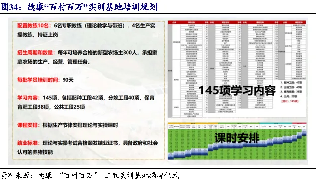 对标丹麦生猪产业“职业教育+农场主持证上岗”体系,德康于国内开创面向家庭农场主的专业化实训平台。丹麦生猪养殖行业中,土地>30公顷的农场主需经历9–10年基础教育、3–5年专业课程及农场实习并通过统一考试后方可持证上岗,且后续有年度持续培训。德康则在国内开创性搭建面向家庭农场主的体系化实训平台,打通“人才供给—标准化落地”的最后一公里。四川宜宾“新农人培育实训基地”已投入运营,该培训基地由公司投资5000万元、占地约50亩,配套对标国际标准的智能化养殖场与教研楼,形成“理论教学+实操演练+经营指导”闭环:每期90天、覆盖145项技能,配置教练10名(6名专职+4名生产实操),年均可稳定培养约300名新型农场主。