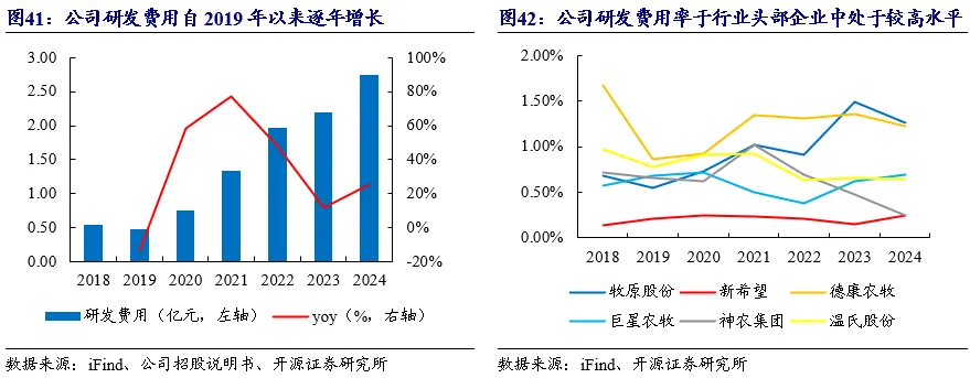 2018年至2024年公司研发投入增长趋势明显,研发费用率处于行业头部上市公司中较高水平。中国生猪市场偏好呈现区域性差异,总体看消费者爱吃“肥而不腻”的猪肉,同时北方需要耐寒品种,南方需要抗热应激、偏好瘦肉率高的肉猪,而西南地区更偏爱脂肪丰富的肥猪。为此,德康一方面持续选育高繁殖力、低料肉比、屠宰性能优秀的种猪,另一方面通过杂交合成整合抗逆性、肉质等性状,培育“中国定制”品种。如今,德康ELY三元猪具备长速快、效率高的特点,配套系的种猪和猪精在国内市场供不应求,更是西南地区市场需求大体型肥猪的优秀素材。