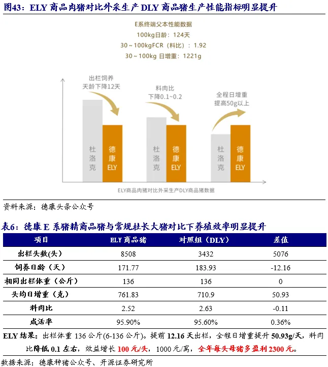商品猪方面,公司优秀基因扩散能力强,最终体现在商品群效率的领先,猪精质量受到市场广泛认可。通过公司内部对比,以公司自主研发的E系种猪猪精生产的商品群(ELY)为例,在136公斤的出栏体重下,ELY商品猪相对于市场主流的传统杜长大三元商品猪(DLY)提前12.16天出栏,全程日增重提升50.93g/天,料肉比降低0.1左右,效益增长约100元/头、1000元/窝,该配套系可使全年单头母猪年增效2300元。随着后续新配套系推广范围的扩大,坚实的育种基础将进一步支撑未来公司生产指标的提升和成本控制水平。