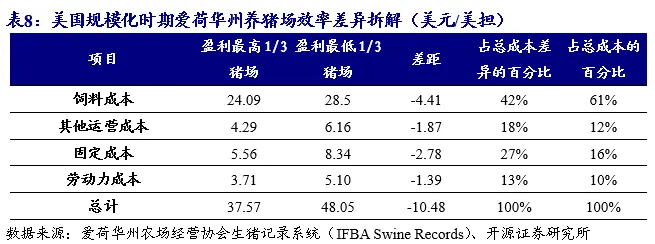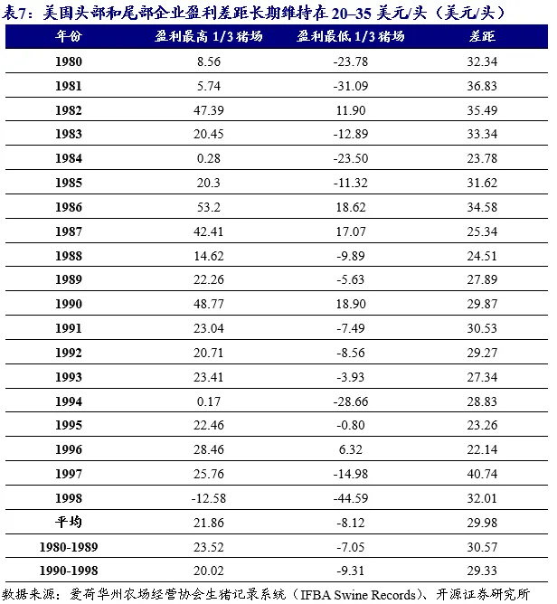 海外经验显示,生猪行业效率优势差异呈放大趋势,往“强者恒强”的结构逐步演变。以美国1980–1998年数据为例,头部1/3猪场与同期尾部1/3猪场的盈利差距长期维持在20–35美元/头,且差距在周期波动中不断扩大。成本与效率拆分看,头部1/3猪场人工成本仅3.71美元/头,较尾部1/3猪场的5.10美元显著领先。养殖效率方面,据美国国家猪肉委员会,头部猪场的PSY、分娩率、断奶前死亡率等关键指标明显高于中尾部猪场,2021年头部10%猪场PSY为29.7,比尾部10%猪场的20.9高出8.8头;断奶前死亡率领先11.9个百分点;分娩率与料肉比同样保持结构性优势。效率差距叠加成本差距,使头部企业在周期中的盈利弹性更强,其商业模式在周期中具有显著复利效应。