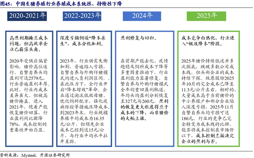 当前国内猪周期经过演化,成本是各大猪企搏杀的核心。非瘟疫情后,行业养殖成本波动下行,头部猪企成本下降明显。据农业农村部监测数据,2024年全国生猪养殖成本由1月份每千克15.7元降至12月份每千克15.1元,主要源于饲料原料价格下滑,玉米和豆粕年内价格降幅分别达16.7%和24.4%。2025Q1-Q3饲料价格波动较小,行业头部企业成本下降主要由于养殖生产成绩、核心生产指标提升,头部猪企如牧原股份,2025年初到Q3末养殖综合成本下降1.5元/公斤。