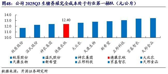 上市猪企中,德康生猪养殖成本长期处于行业第一梯队。公司通过育种端积累的技术优势和精准饲喂技术的领先,有效降低生猪养殖综合成本。我们测算,2025Q3公司“二号家庭农场”、“一号家庭农场”和自繁自养模式的完全成本分别约为11.95元/公斤、12.45元/公斤和12.70元/公斤。公司主要产销区为西南地区,山地地形降低了疫病防控成本;作为传统猪肉主产区,产业链完善、消费市场大,且生猪销售均价较高;当地政企协同效率高,政策支持力度大。同时也面临远离东北饲料主产区导致的运输成本较高,日照少、静风天气多不利于猪舍环境保持等挑战。