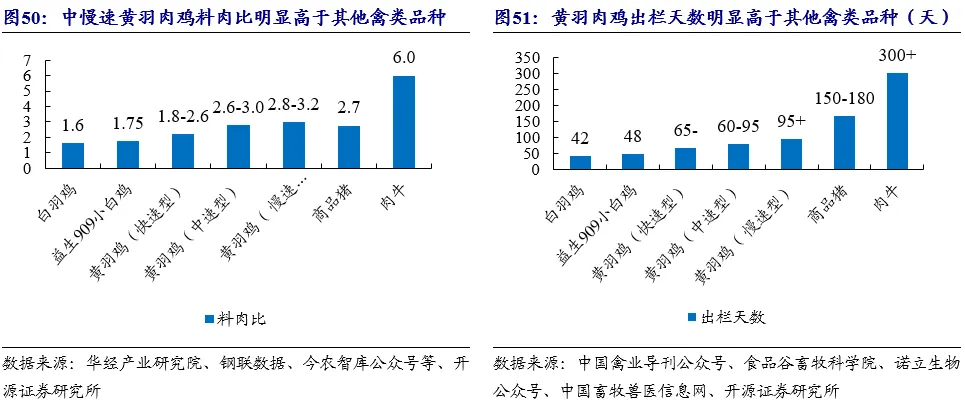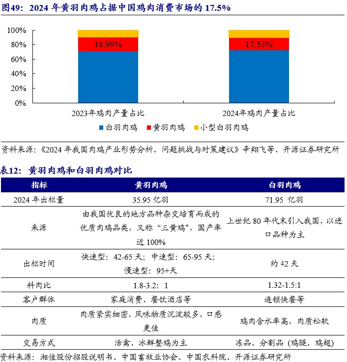 黄羽肉鸡作为本土肉鸡品类,是国内肉鸡市场重要构成。我国肉鸡主要包括白羽肉鸡、黄羽肉鸡、817肉杂鸡和淘汰蛋鸡。白羽肉鸡属于快大型肉鸡,与黄羽肉鸡相比,其特点是生长速度快、料肉比较低、产肉量多,适合工业规模化生产但是口感欠佳。黄羽肉鸡是我国自主培育的肉鸡品种,具有品种多、生长周期长抗病能力强等特点,其肉质口感鲜美,更符合我国传统的烹调习惯。黄羽肉鸡按照生长速度可分为快速、中速、慢速三种类型,其中快速型(65天以内出栏)、中速型(65-95天以内出栏)、慢速型(95天以上出栏)占比分别约为30%/45%/25%。其中,中速型是冰鲜产品的优质原料,慢速型养殖成本更高,口感更佳,主要供应中高档餐厅、酒店及家庭消费。