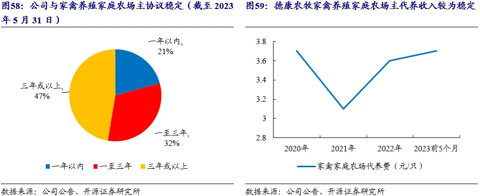 (4)“二号农场”模式投入大、培训周期长,农户与公司合作更稳固。该模式通过农户收益与养殖成绩直接挂钩的机制形成了深度合作,对农户而言具有代养费高,盈利持续性强的优势。截至2023年5月,二号农场合作三年以上的比例高达77.1%,远超传统农户代养模式,为生产的连续性与出栏的稳步增长提供了坚实保障。