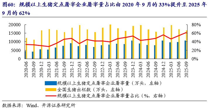公司屠宰业务聚焦采用分割与欧盟标准,技术溢价与渠道拓展驱动毛利率结构性提升。公司屠宰业务采用在线分割工艺,依托德国通内斯技术建设亚洲领先的100万头级在线分割生产线,实现从屠宰到精深加工的无缝衔接。该模式通过精细化分割提升肉品附加值,通过技术升级对盈利能力产生直接拉动。行业来看,2020年9月至2025年9月,规模以上生猪定点屠宰企业屠宰量占比大幅提升,显示生猪屠宰行业屠宰量向头部企业集中的趋势。