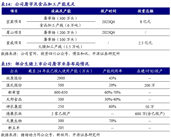 全产业链协同抵御周期波动,养殖屠宰一体化释放规模效益。公司通过“饲料-养殖-屠宰-食品”闭环运营,公司在四川宜宾、仁寿布局全国最高标准的2家生猪屠宰场,宣威拥有100万头生猪屠宰及冷链物流项目,总产能满产约600万头。公司2025H1屠宰产品收入4.81亿元,同比增长16.1%;屠宰量24.9万头,同比增长18.5%,显示下游业务增长动能。单宜宾项目年300万头屠宰产能全面投产,将带动5000人就业、创造150亿元产值,通过深加工环节对冲生猪价格波动风险,实现从周期波动型养殖企业向稳健增长型食品企业的战略转型。