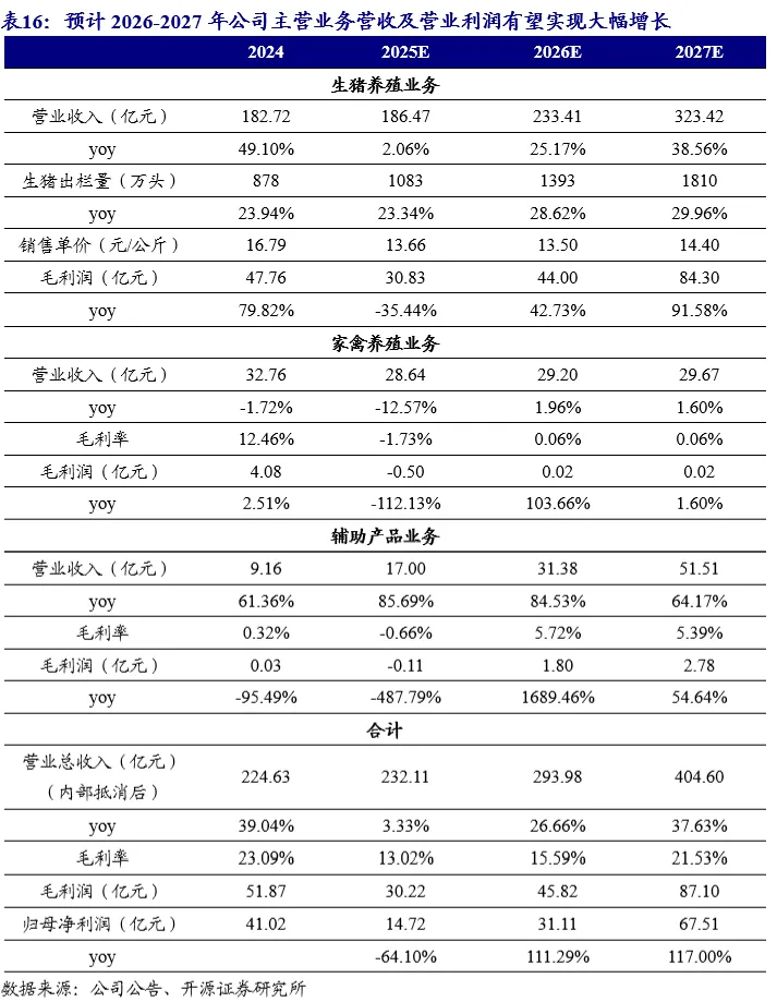 主要为屠宰业务及销售生鲜肉、饲料原料等,非公司核心业务,我们预计2025-2027年辅助产品业务受益于屠宰业务产能利用率提升,营业收入分别为17.00、32.05、51.51亿元,毛利率分别为-0.66%、5.72%、5.39%。