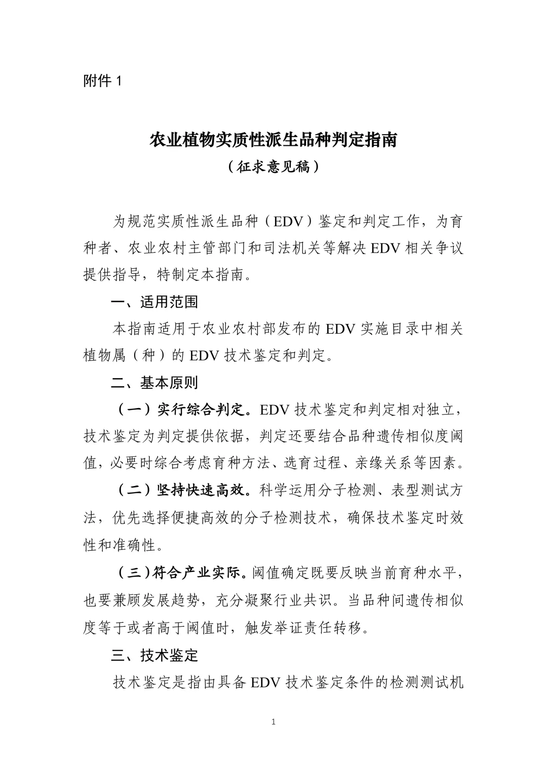 为贯彻落实《中华人民共和国种子法》《中华人民共和国植物新品种保护条例》,做好实质性派生品种(EDV)制度落地实施,加强植物新品种权保护,鼓励育种原始创新,我办组织拟定了《农业植物实质性派生品种(EDV)判定指南(征求意见稿)》《水稻等10种作物实质性派生品种(EDV)判定阈值(征求意见稿)》,现向社会公开征求意见,请于2026年3月27日前通过电子邮件方式进行反馈。