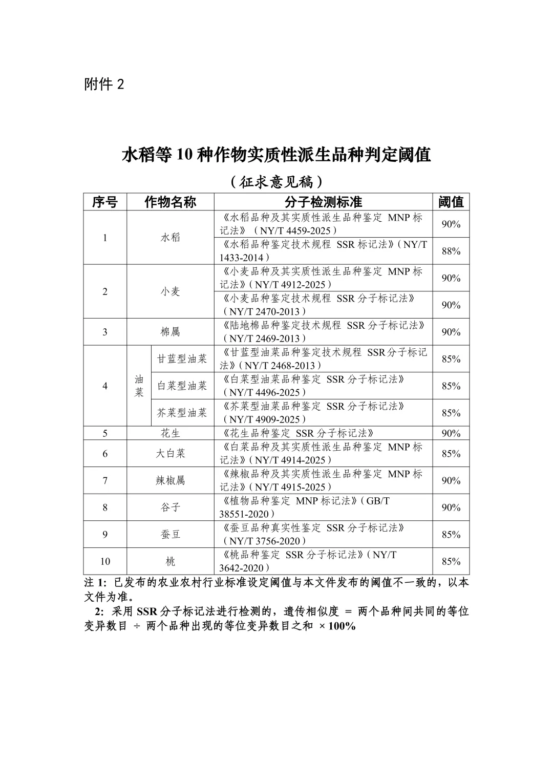 附件:2.水稻等 10 种作物实质性派生品种判定阈值 (征求意见稿)