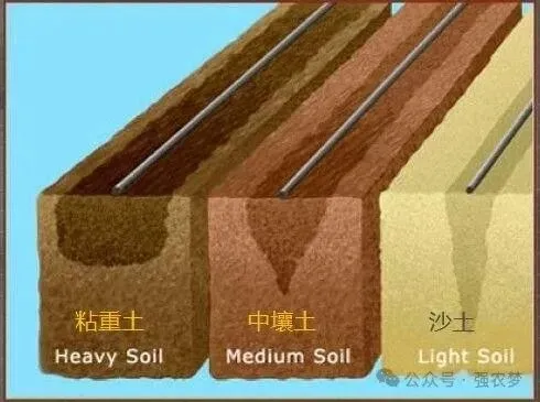 因为地区和土质不同,所以滴灌带选择也不同。生产中我们一般根据土壤的透气性和透水性把土壤分为粘土、壤土和沙土三大类。粘土:土壤颗粒较细,颗粒之间孔隙小,透气性和透水性较差,水分下渗缓慢。沙土:土壤颗粒较大,颗粒之间空隙大,透水性和透气性较好,水分下渗速度快。壤土:土壤颗粒粗细适中,颗粒之间孔隙适中,透水性和透气性适中,水分下渗速度适宜。下图是三类土壤的性质不同导致了滴灌水分下渗的速度和路径示意图:粘土:水分下渗速度慢、横向两侧移动快但纵向向下移动慢。沙土:水分下渗速度快、纵向向下移动很快但横向两侧移动慢。壤土:水分下渗速度适中,横向两侧移动速度和纵向向下移动速度基本相近。了解了不同土质滴灌水分移动和变化规律,我们就可以根据土壤类型选择合适的滴灌了。壤土地的渗漏效果是最好的,我们滴灌地都要力求达到壤土地的渗漏效果。