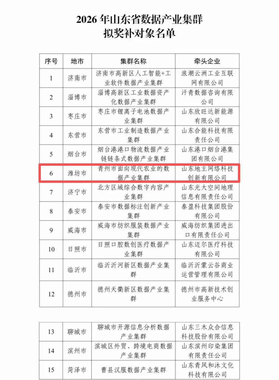 近日,2026 年山东省数据产业集群拟奖补对象名单正式公示,芒种集团旗下地主网络的“青州市面向现代农业的数据产业集群”成功入选,成为山东省唯一聚焦现代农业领域的省级数据产业集群!这既是对集团深耕数字农业、助推产业数字化升级的高度认可,更标志着潍坊市在农业数据要素市场化配置改革中走在了全省前列。