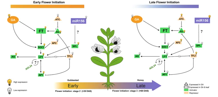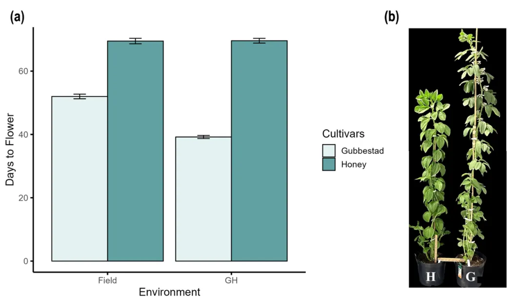 研究人员选取早花品种Gubbestad和晚花品种Honey为试验材料,人工气候箱培养结果显示,Gubbestad在播种后39天(DAS)开花,Honey开花时间则推迟至68DAS,二者在田间和温室环境下均表现出稳定的开花时间差异(图 1)