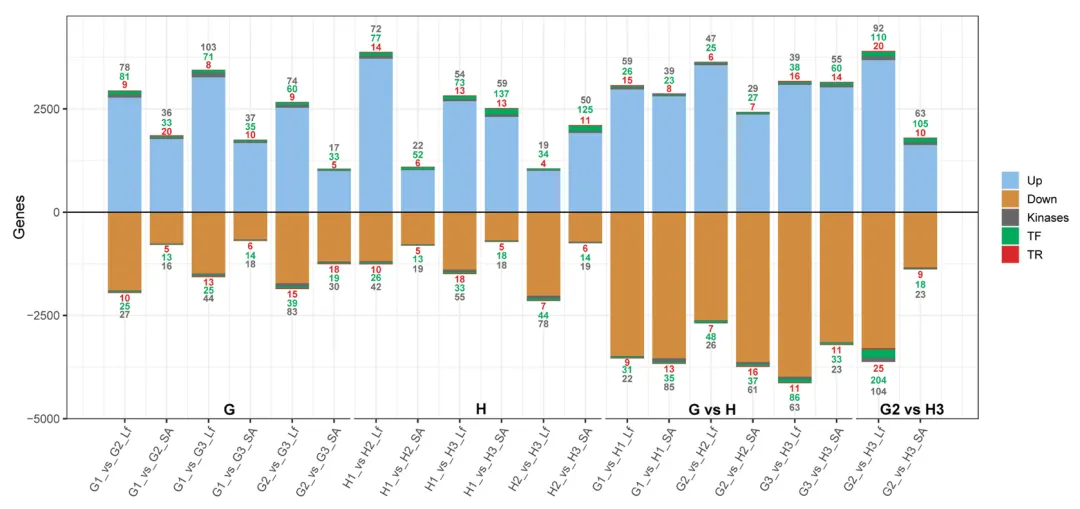 转录组测序共获得平均每样品 7276 万条高质量读段,75% 的读段可唯一比对到蚕豆参考基因组,数据深度满足后续分析要求。以 | log₂(倍变化)|≥1、假发现率(FDR)<0.05 为标准,全样本共鉴定出 16864 个差异表达基因(DEGs),不同品种、发育阶段、组织间的 DEGs 数量和调控类型存在显著差异(图 2)。