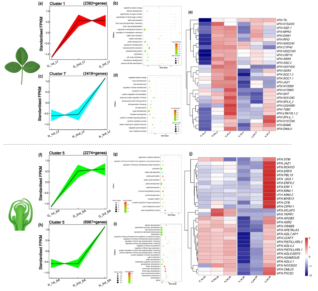 对 DEGs 进行 GO 富集分析,结果显示蚕豆开花诱导的基因功能富集存在品种特异性时序和组织特异性分工:Gubbestad 在 39 DAS 时,叶片已富集赤霉素(GA)合成 / 代谢、光信号响应相关通路,茎尖富集花分生组织生长、营养 - 生殖阶段转换通路;而 Honey 上述开花相关通路均延迟至 68 DAS 才显著富集,且茎尖的富集程度更高。对 DEGs 进行 K-means 聚类分析(最优聚类数为 12),结果显示早花、晚花品种的开花相关基因聚为特异性表达簇,Gubbestad 的开花关键基因在 39 DAS 即出现表达峰值,而 Honey 的同源基因表达峰值推迟至 68 DAS;叶片和茎尖的开花相关基因聚类无明显重叠,表明叶片主要介导环境信号感知,茎尖主导成花转换与花发育的执行(图 3)。