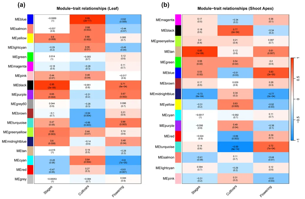 以 FPKM>1 的基因为基础,构建叶片和茎尖的加权基因共表达网络(WGCNA),确定最优软阈值为 12,最终在叶片中鉴定出 18 个共表达模块,茎尖中鉴定出 16 个共表达模块,模块与开花时间、品种、发育阶段的关联存在显著组织特异性(图 4)。