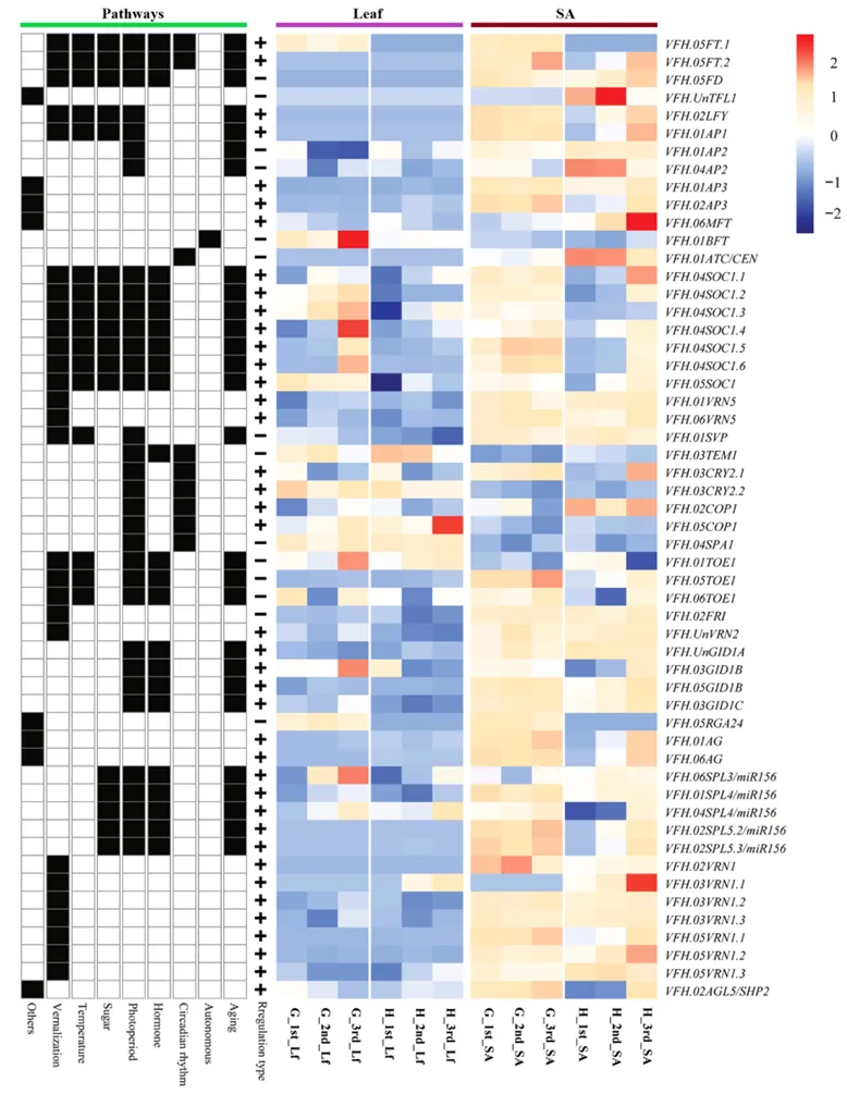 图6 拟南芥中参与调控蚕豆叶片及SA开花过程的部分关键基因的表达热图