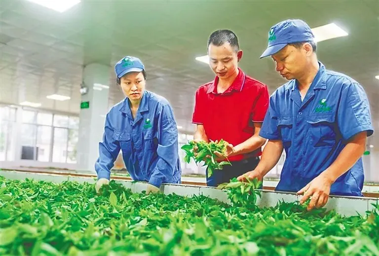 把新鲜采摘的茶叶铺开,摊放在萎凋槽,空气中弥漫着新鲜茶叶特有的清香……海垦白沙茶业公司生产车间内一片繁忙,生产线高速运转,工人们紧张有序地进行茶青的萎凋、揉捻等工序,各环节衔接紧密、高效运转。
