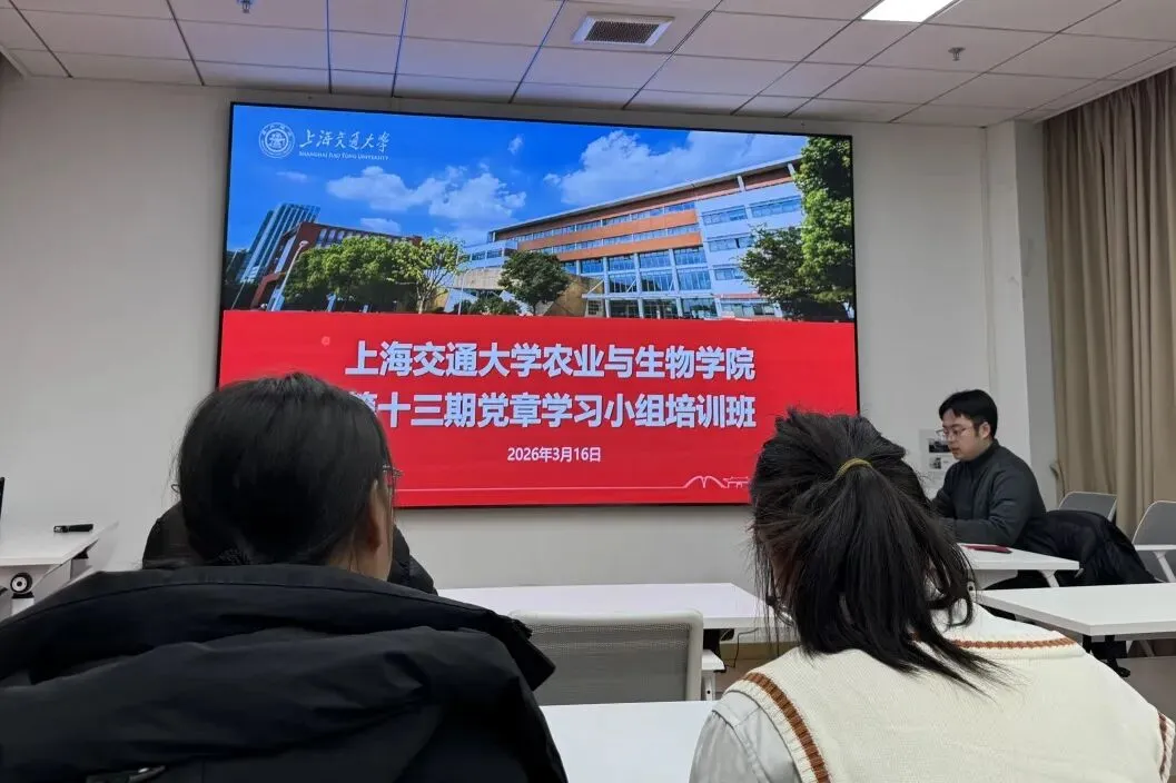 上海交通大学农业与生物学院第十三期《党章》学习小组开班典礼于2026年3月16日晚在农业与生物学院B楼301会议室顺利举行。此次活动旨在加强同学们对《中国共产党章程》的学习与理解,引导同学们强化理论武装,筑牢信仰之基,不断提升党性修养,从而在思想上、行动上自觉向党组织看齐。凝聚起积极向党组织靠拢的青春力量。学院学生党建指导教师陈林屾、辅导员张维新,学生党建研究会主席团成员于子钦、张陈佳一与第十三期《党章》学习小组全体学员参与本次活动。活动由于子钦负责主持。