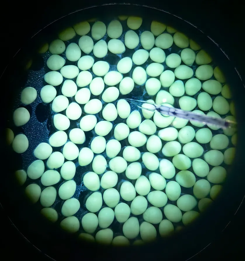 ▲显微镜下科研人员观察鱼卵。雷键 摄