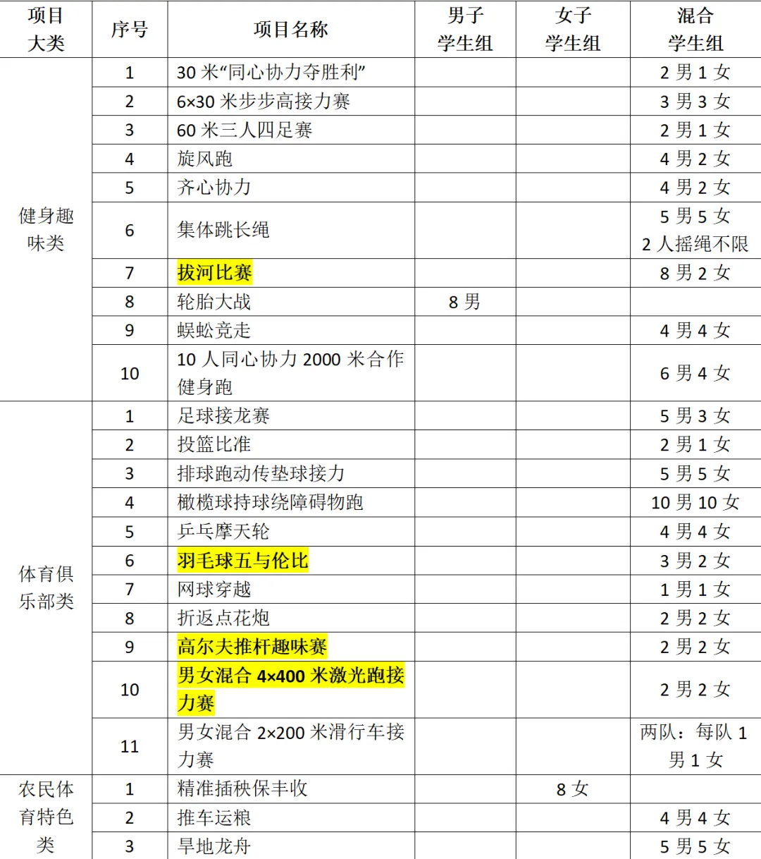 6.伤病换人:非田径竞技类集体项目参赛队员因病、因伤赛前可允许换人,其它项目不允许换人。须在4月20日前联系群里工作人员提交盖章的请假条,替换的运动员必须是已经报名非田径竞技类集体项目的学生。