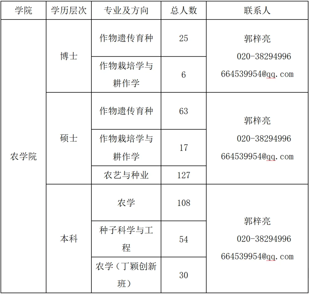 园艺学院2026届共有毕业生395人,其中含博士生17人,硕士生195人,本科生183人。学院拥有1个一级学科博士学位授权点(园艺学)和1个农业专业博士(园艺领域)授权点,5个二级学科博士学位授权点(果树学、蔬菜学、茶学、园艺产品采后科学、观赏园艺学),7个硕士学位授权点以及1个博士后流动站。建成研究生联合培养基地22个、科技小院2个,拥有省部级以上科研平台11个。农艺与种业专业下设园艺科学、种业科学等研究方向。学院以“立德树人、强农兴农”为己任,致力于培养“立足华南,面向全国,具有国际视野”,德、智、体、美、劳全面发展的高层次学术型和应用型人才。