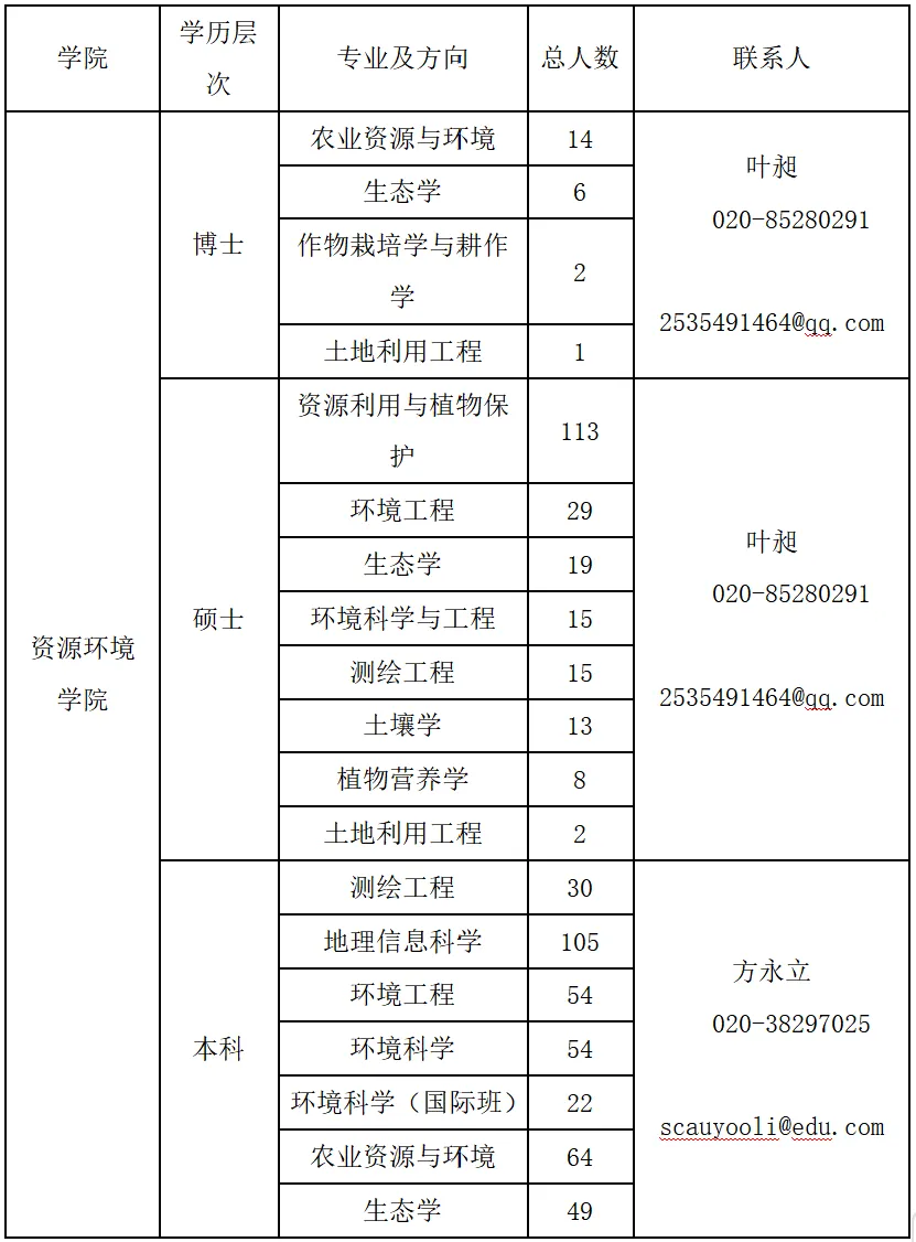 资源环境学院2026届共有毕业生615人,其中含博士生23人、硕士生214人、本科生378人。现有生态学、农业资源与环境、环境科学、环境工程、地理信息科学、测绘工程6个本科专业,环境工程与生态学均为国家级一流本科专业建设点,也是广东省特色专业和广东省综合改革试点专业。目前在农业资源与环境、生态学2个学科形成了“学士-硕士-博士-博士后”人才培养体系。