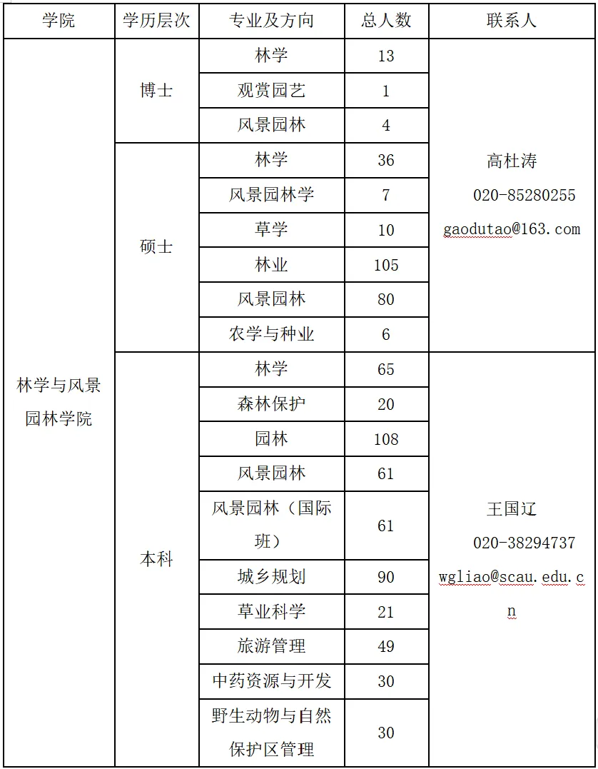 林学与风景园林学院2026届共有毕业生797人,其中含博士生18人、硕士生244人、本科生535人。学院目前开设林学、风景园林、园林、城乡规划、森林保护、旅游管理、草业科学、中药资源与开发、野生动物与自然保护区管理9个本科专业,其中林学学科为国家林业局重点学科,林学、风景园林和园林3个专业为国家一流本科专业建设点、森林保护专业为广东省一流本科专业建设点。林学专业开设“丁颖创新班”,风景园林专业与澳大利亚纽卡斯尔大学合作开办风景园林本硕连读国际班,城乡规划专业设置乡村振兴方向,野生动物与自然保护区管理专业与广州长隆集团合作开办“长隆班”。招收林学、风景园林专业的博士生,招收林学、草学、林业、农艺与种业和风景园林专业硕士。