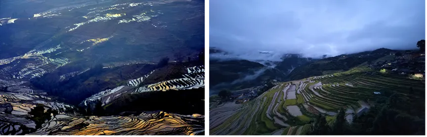 图1 日出中的哈尼梯田(左)和夜幕下的加榜梯田(右)