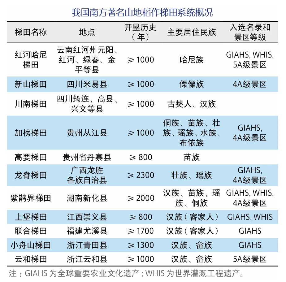 中国的地势西高东低,呈三级阶梯状分布,丘陵与山地广布。相较于欧洲、南美及中国北方以旱作为主的梯田系统,中国南方及菲律宾等地得益于充沛的降水和适宜的气候条件,先民很早就开始驯化野生稻种(如哈尼红米),发展出独具特色的山地稻作梯田系统,并孕育了灿烂悠久的稻作文化。这一宏伟的农业景观,正是“基于自然的解决方案”(Nature-based Solution, NbS)在中国大地上的卓越实践与生动典范。我国南方地区分布着多处拥有数百年乃至上千年耕作历史的稻作梯田系统,如云南红河哈尼梯田、贵州从江加榜梯田、广西龙胜龙脊梯田、湖南新化紫鹊界梯田、江西崇义上堡梯田、福建尤溪联合梯田、浙江丽水云和梯田等[3]。其中的多处梯田系统已被列入联合国粮农组织的“全球重要农业文化遗产”(Globally Important Agricultural Heritage Systems, GIAHS)以及国际灌溉排水委员会的“世界灌溉工程遗产”(World Heritage Irrigation Structures, WHIS)名录,成为了人类农业文明的瑰宝。