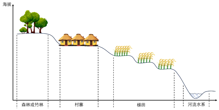 稻作梯田沿着等高线修筑而成,其连片成山的壮丽景观历经漫长岁月雕琢。尽管部分梯田的历史可以追溯到秦汉时期,但大规模开发多集中于唐宋时期,至明清时期基本形成今日所见之规模,这与农业生产技术的进步及人口迁移密不可分。典型的稻作梯田系统呈现清晰的立体景观结构:山顶多为森林或竹林;山腰部位一般为村寨与聚居点;山腰以下直至山脚则为层层叠叠的梯田。这种复合立体的景观结构,在水土保持方面作用显著。山顶的森林与竹林不仅提高了植被覆盖率,有效防止水土流失,还起到涵养水源的作用,通过地表与地下径流为居民提供源源不断的生产与生活用水。稻作梯田多为阶台式,沿陡峭山坡的等高线修建,形成逐级而上的水平阶地,既减少了动用的土方量,又以石砌或夯土加固阶地边缘的田埂,便于蓄水和抑制水土流失。村寨则坐落于森林与梯田之间,便于取水与农耕,这一合理的立体景观结构维系着梯田系统千年不衰的运转。