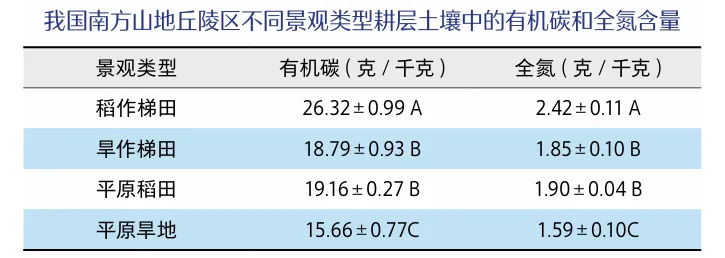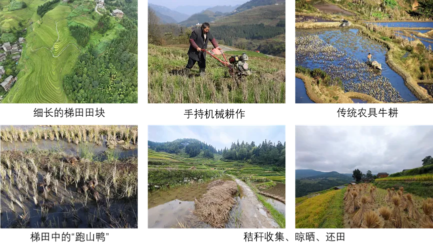 稻作梯田的修建及其独特的农业管理方式,深刻改变了土壤性质,进而影响有机碳动态及土壤生态系统服务功能(图3)。梯田田块面积小,最窄处仅数十厘米,仅能插下两三行秧苗,俗语就有“青蛙一跳三块田”的说法。受地形限制,在梯田中无法使用大型机械,耕作多依赖手持机械设备或使用传统农具牛耕。这种更低强度的传统耕作方式保护了土壤团聚体结构,而土壤团聚体的稳定与有机碳的固存密切相关。此外,当地居民在田间推行稻-鱼-鸭复合生态种养,不仅丰富了山区食物来源,形成了“饭稻羹鱼”的传统生活方式。鱼和鸭的排泄物还田还可提升土壤肥力,其在田间的活动还能抑制病虫害,减少农药化肥施用,维护系统生物多样性。梯田多种植单季稻或双季稻,在冬季则进行灌水养田或种植绿肥。受交通条件限制,水稻秸秆多就地焚烧还田或直接粉碎还田。低强度的耕作制度配合秸秆还田,共同维系了梯田的土壤健康,使其在千年耕作后仍葆有生机。