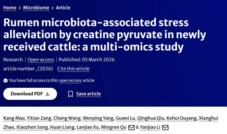 近日,江西农业大学动物营养与饲料江西省重点实验室瞿明仁教授团队在缓解肉牛运输应激微生态机制方面的最新研究成果以“Rumen microbiota-mediated stress alleviation by creatine pyruvate in newly received cattle: A multi-omics analysis”( https://link.springer.com/article/10.1186/s40168-026-02365-1)为题在微生物学领域国际知名期刊《Microbiome》(5年IF=16.6,中国科学院一区Top)上发表。江西农业大学2023级博士研究生毛康和臧一天副教授为论文第一作者,国家肉牛牦牛产业技术体系原岗位专家瞿明仁教授和李艳娇副研究员为论文通讯作者。